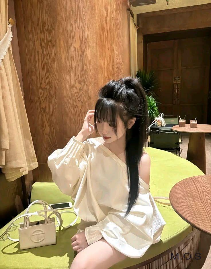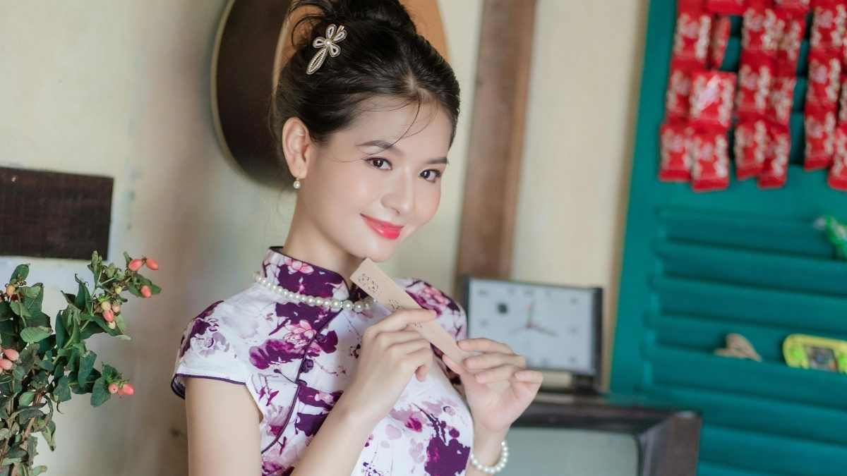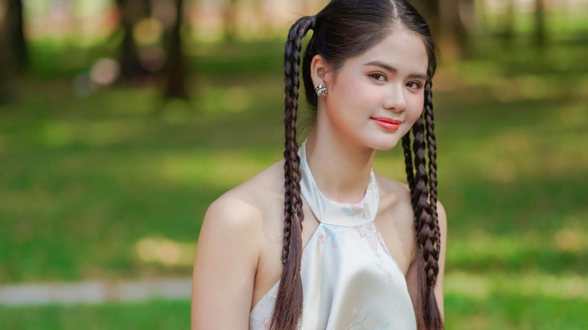 Cô gái xinh đẹp với nụ cười tươi tắn, mái tóc dài bồng bềnh và trang phục thanh lịch, toát lên vẻ dịu dàng, duyên dáng của người con gái Việt. Vẻ đẹp tự nhiên và cuốn hút.
