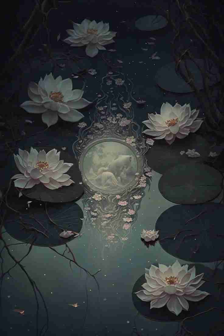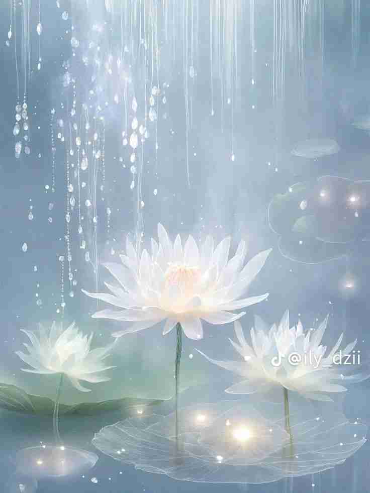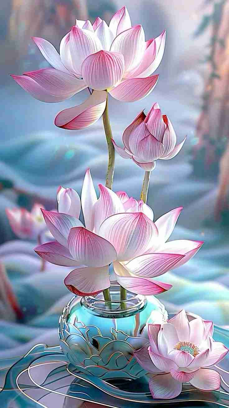 Ảnh hoa sen tinh khôi với các tông màu trắng, hồng, và xanh ngọc, thể hiện sự thanh tịnh cao quý.