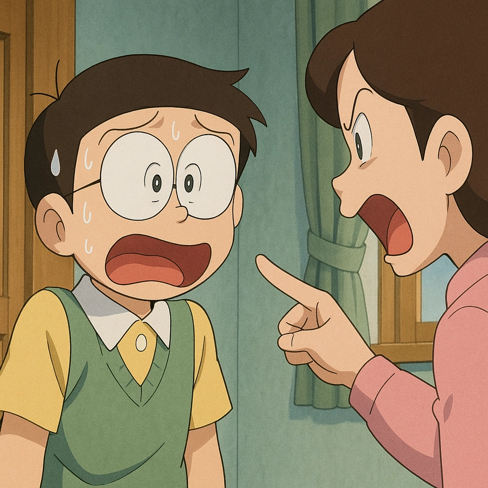 Nobita trong một khoảnh khắc thể hiện sự ngầu lòi, với biểu cảm tự tin. Hình ảnh này thể hiện rõ nét sự thay đổi trong tính cách của Nobita, từ một cậu bé nhút nhát trở nên mạnh mẽ hơn.