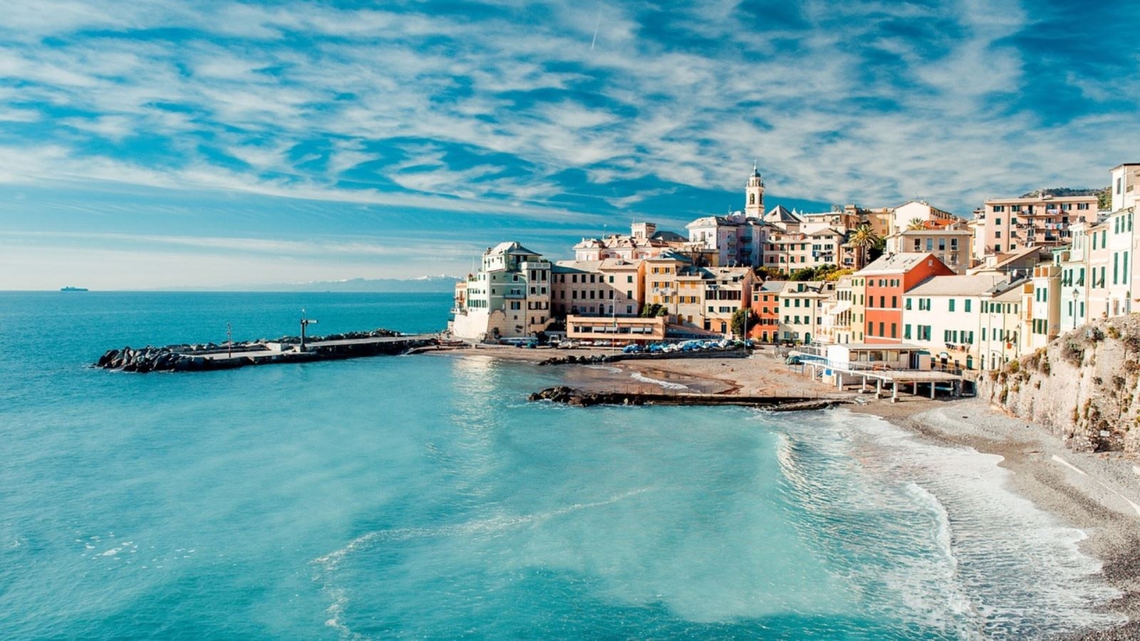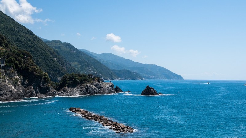 Bức ảnh biển cả bao la với màu xanh ngọc bích tuyệt đẹp, bầu trời trong xanh điểm xuyết vài áng mây trắng bồng bềnh. Cảnh quan thiên nhiên hùng vĩ và thanh bình.