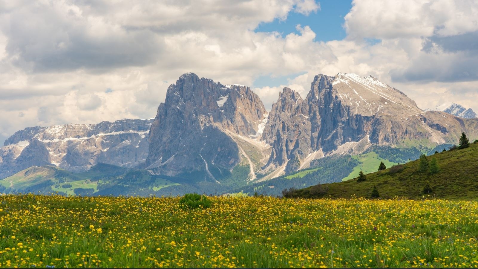 Khung cảnh thiên nhiên hùng vĩ hiện lên trong bức ảnh, với những ngọn núi cao vút và bầu trời trong xanh. Đây là một hình nền phong cảnh tuyệt đẹp để trang trí cho màn hình máy tính của bạn.