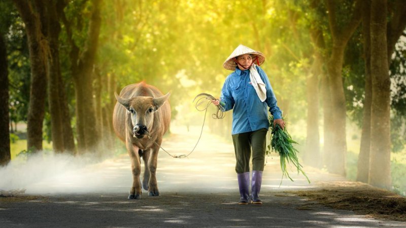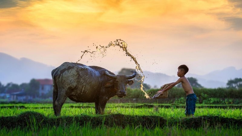 Bức ảnh này thể hiện vẻ đẹp thanh bình của một vùng quê yên ả, với cánh đồng lúa chín vàng trải dài đến tận chân trời, phía xa là những ngọn núi xanh mờ ảo trong sương sớm. Ánh nắng ban mai nhẹ nhàng chiếu rọi, tạo nên một khung cảnh nên thơ và trữ tình, mang đến cảm giác thư thái và bình yên cho người xem. Một không gian lý tưởng để trốn khỏi sự ồn ào và náo nhiệt của cuộc sống hiện đại.